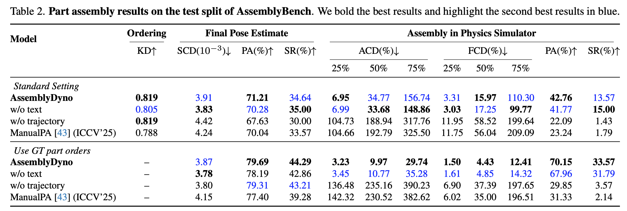 We compare state-of-the-art methods on the AssemblyBench dataset on a variety of settings, including comparisons on predicting the part order, the final assembled poses of parts, and the assembly trajectories. Our evaluation also uses a physics engine, as shown on the right side of the results table.