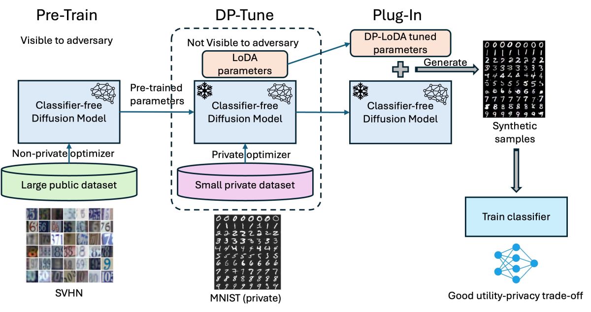We propose combining Parameter-Efficient Fine-Tuning (PEFT) techniques with Differentially Private Stochastic Gradient Descent (DP-SGD) to enable effective, private adaptation of public foundation models on potentially sensitive data. Specifically, we incorporate Low-Dimensional Adaptation (LoDA) modules to attain more efficient utilization of the privacy budget during differentially private fine-tuning of diffusion models. Our experiments demonstrate that these models can be leveraged to privately generate synthetic data for training downstream classifiers effectively, while achieving an advantageous privacy-accuracy tradeoff.